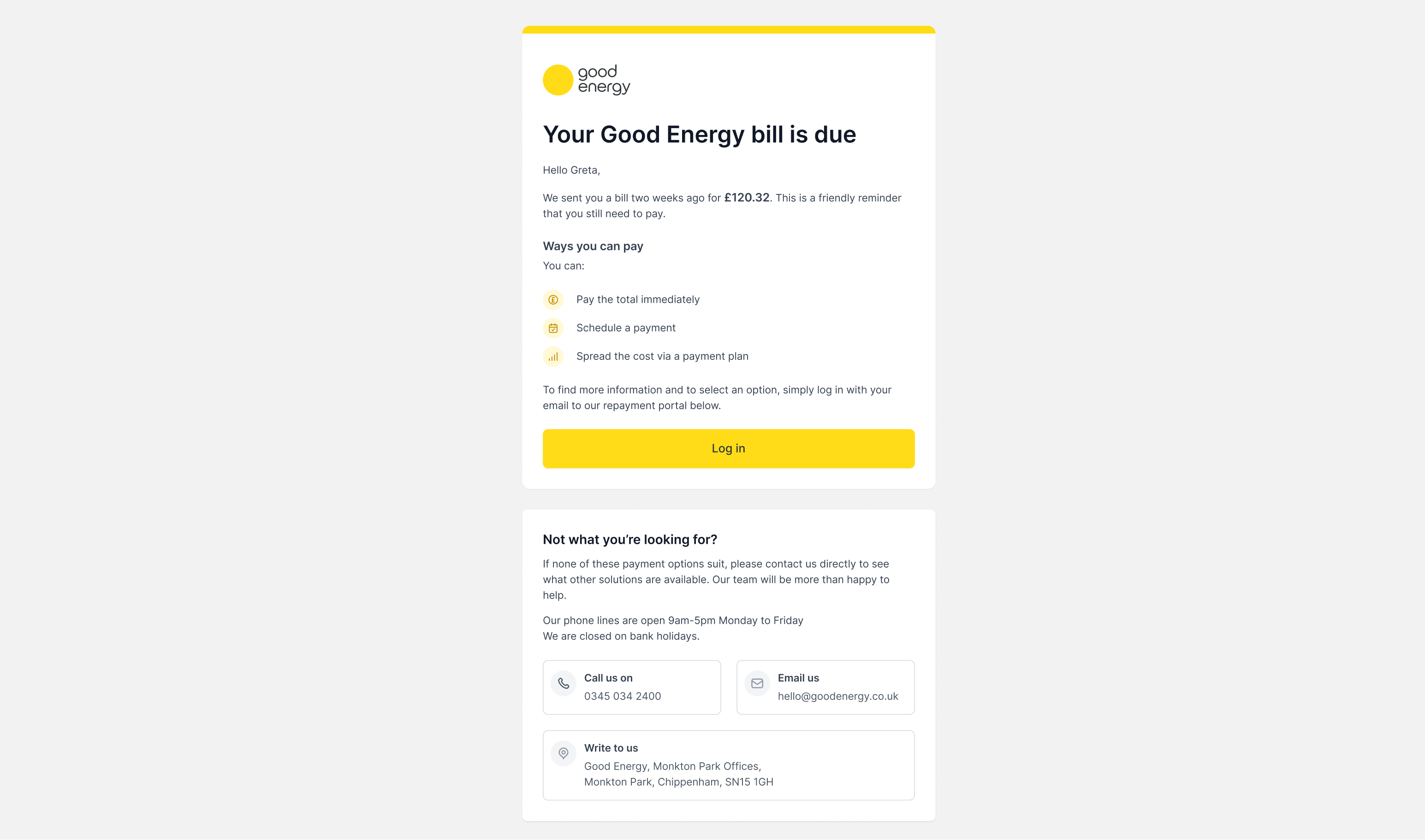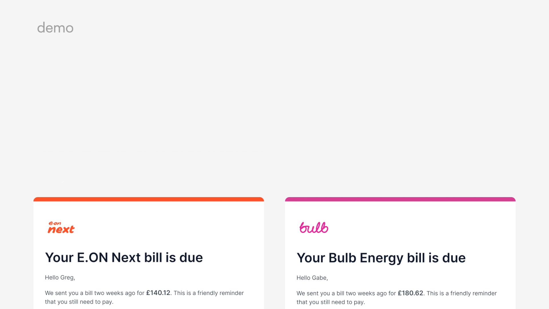 Component based email design templates for a customer focused whitelabel debt collection product. The template built on the core brand principles accommodates the primary colour and logo for each brand.